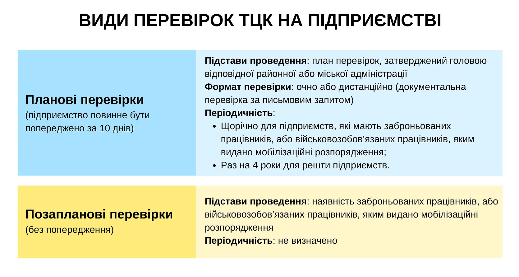 Перевірки ТЦК на підприємстві можуть бути двох видів: планові та позапланові. Чим вони відрізняються - нижче на зображенні.