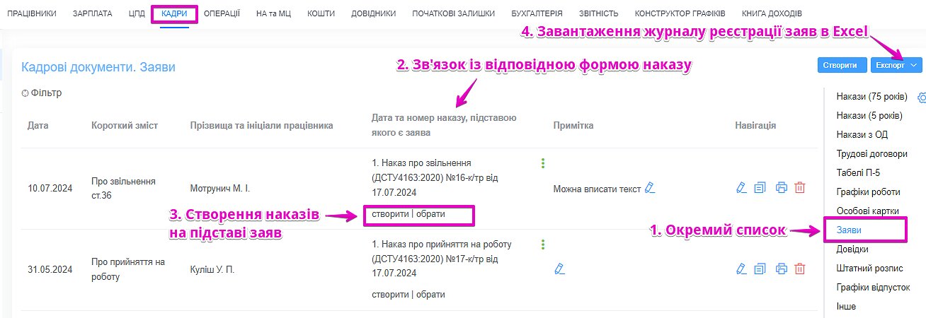 Заяви працівників: список, журнал реєстрації, зв'язок з наказами
