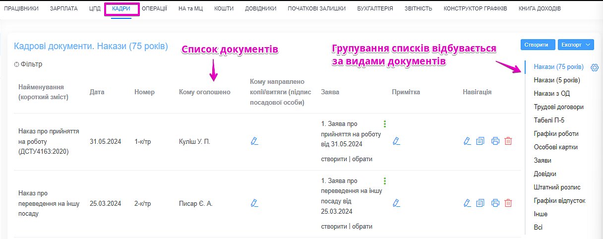 - згруповані накази в меню КАДРИ; при створенні кожний наказ потрапляє у свою групу;
