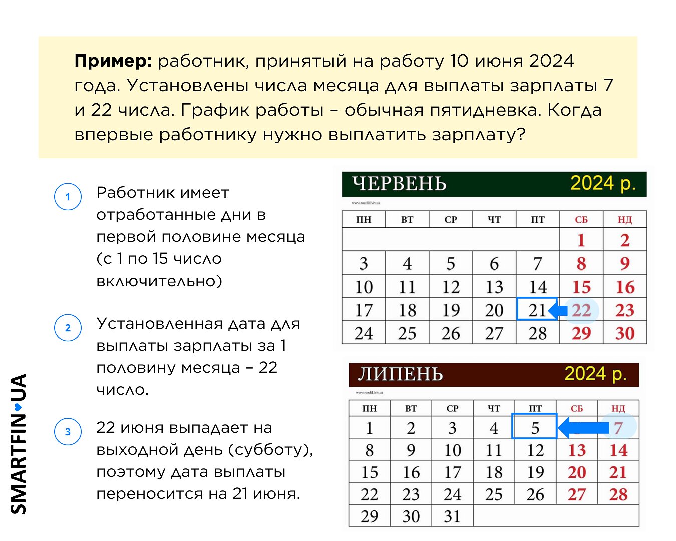 Итак, зная дату принятия работника (10 июня 2024 г.) и установив два конкретных числа месяца для выплаты зарплаты (22 и 7), легко ответить на вопрос: Когда же выплачивать зарплату работнику.