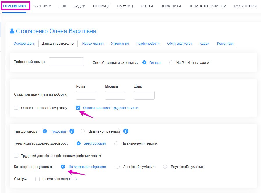 5. Оптимизировали настройки в карточке работника по поводу наличия трудовой книжки
