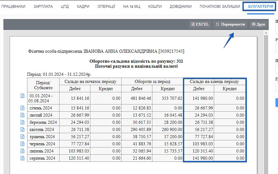 6. В меню "КНИГА ДОХОДОВ" отразили сумму остатка до лимита дохода ФЛП на едином налоге